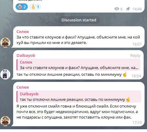 Пидор-петух Селюк очень просит вас перестать ставить ему в канале клоунов, прекратите, пожалуйста!