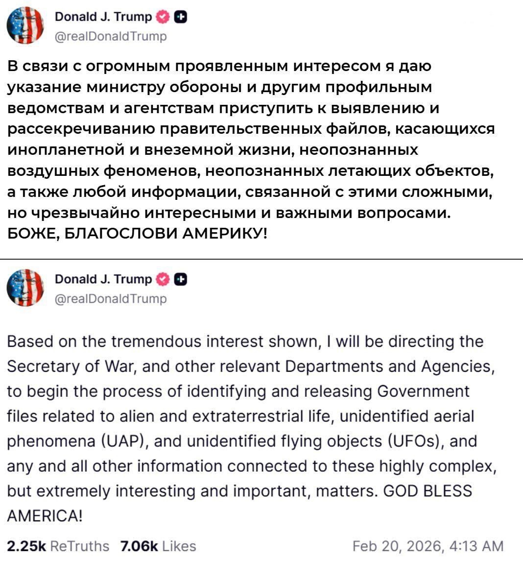 Дональд Трамп написал в TruthSocial, что поручит Пентагону и другим профильным ведомствам начать процесс публикации государственных архивов, касающихся внеземной жизни и НЛО, а также любой другой информации об «этих очень сложных, но чрезвычайно интересных и важных вопросов».