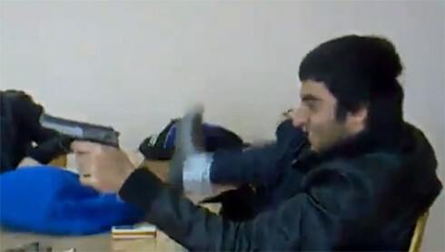 Школьник целится из пистолета в учителя