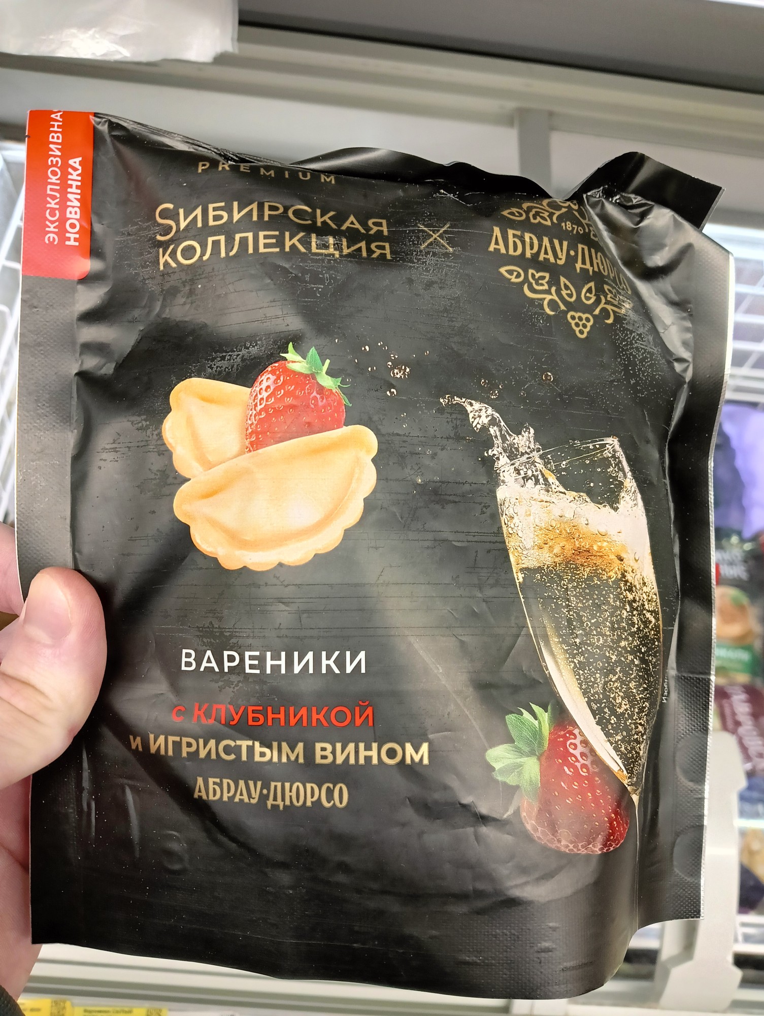 Сегодня заметил в продаже такие вареники. Клубничка, шампанское...