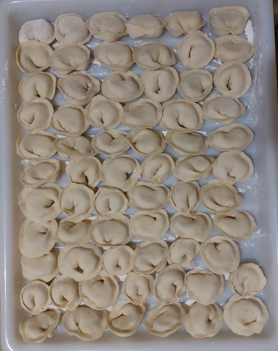 Ещё готов противень маленький с пельмешками русскими.