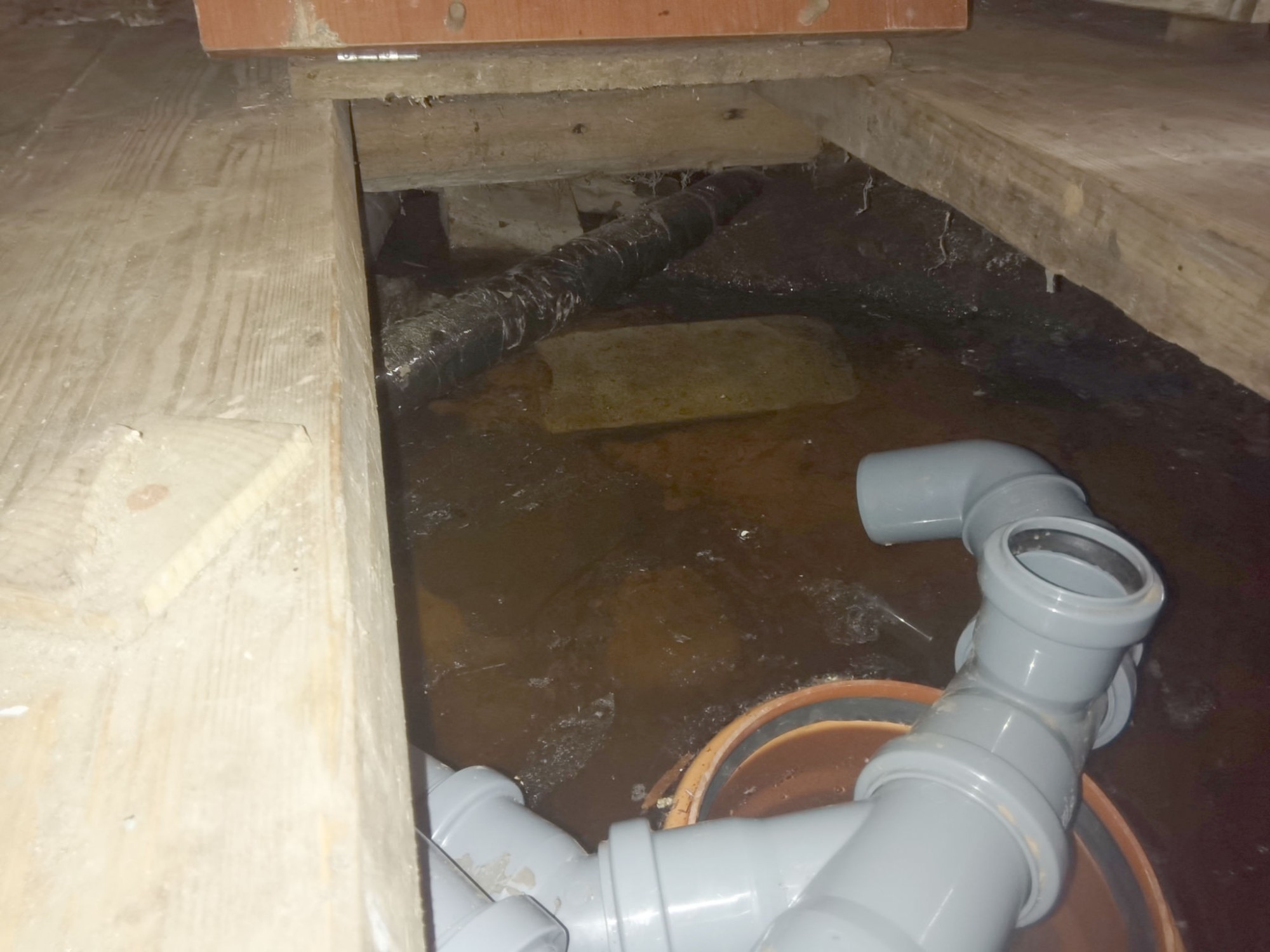 Септик затопило. 12-вольтовый дренажный насос не помог. До пола сантиметров 15 от воды. Летом надо будет купить фундаментные блоки и поднять дом на 15-20 см. Но предварительно нужно полностью разобрать пол в тамбуре, так как он был пристроен позже и жёстко не привязан к домику.