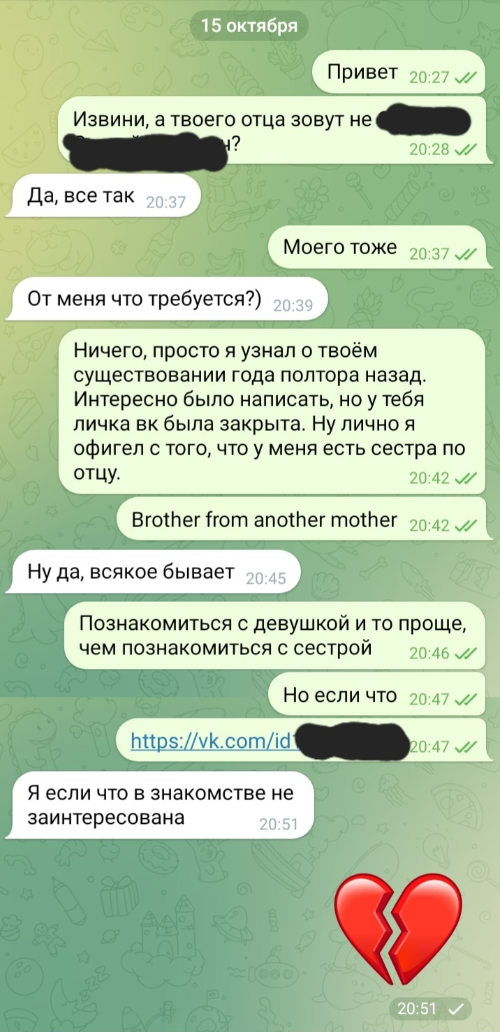 Такая ситуация случилось. Меня бросил батя еще до моего рождения. Недавно узнал, что оказывается у меня есть сестра на пол-года младше меня. Выходит у нас один отец и разные матери. Написал ей. Результат на пикрилейтед...Мнение?