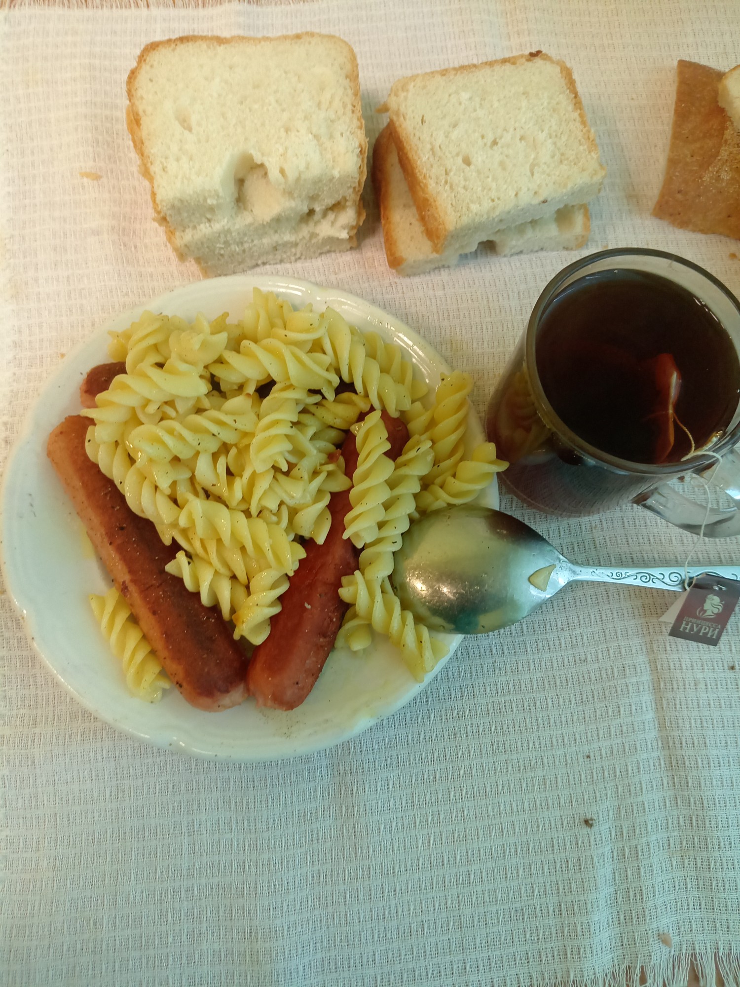 сосиски моя цена, макарошки шебекинские, оставшиеся с вечера, чай нури отборный, хлебушек, простая но сытная едушка