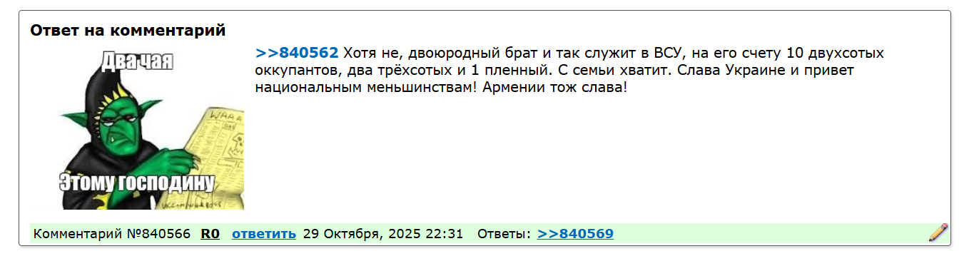 >>840562 Хотя не, двоюродный брат и так служит в ВСУ, на его счету 10 двухсотых оккупантов, два трёхсотых и 1 пленный. С семьи хватит. Слава Украине и привет национальным меньшинствам! Армении тож слава!