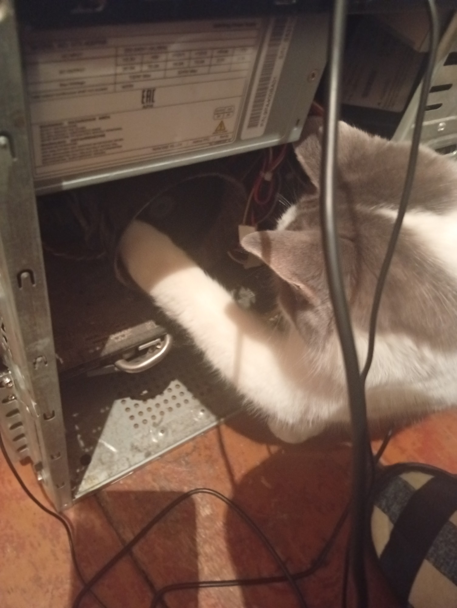Я снял с системного блока крышку сбоку, у меня кот теперь изучает внутренности компа, вынюхивает чё-то, суёт лапу в вентилятор