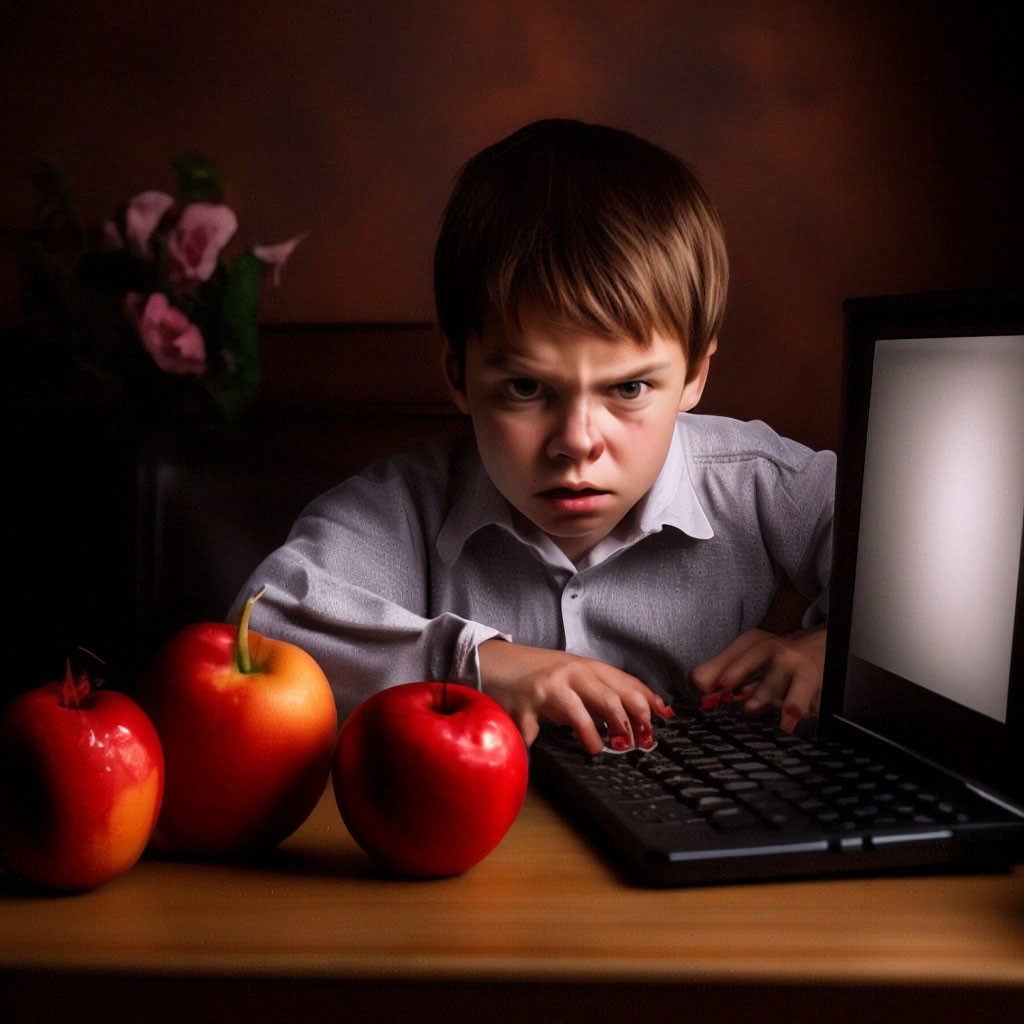 Злой школьник сидит за компьютером с яблоком" - картинка создана в Шедеврум