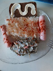 Русский завтрак полезный очень вкусный исключительный из натуральных ингредиентов рис с паприкой сардельки вкуснейшие социалистические салаты из морской капусты Бородинский с майонезом всё натуральное исключительно вкусно по древнерусским рецептам