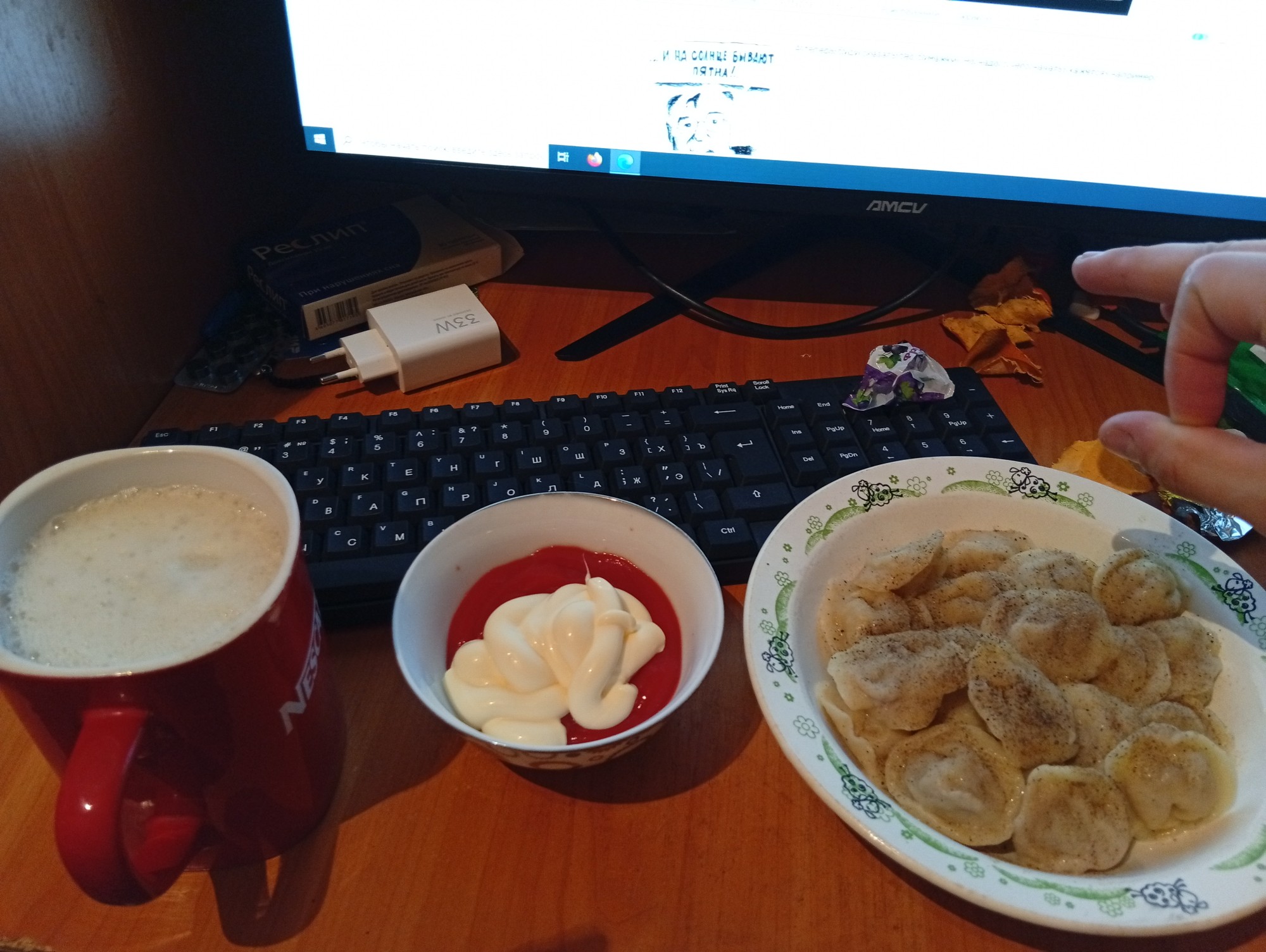 пью хуч, кот сидит на коленках, мамка варит пельмени. хорошо.