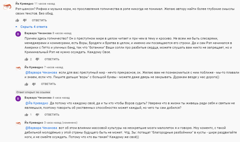 мы пиздюками слушали "красную плесень" и прочее, но некрофилами не стали. А совки были самой читающей нацией, и в результате разрушили "такую страну"! Это говно все. У меня были проблемы со всякими криминальными типами, мне даже пришлось покинуть свое прошлое место обитания из за этих АУЕшников ебаных, вот только они становятся АУЕшниками не из за музыки, а из за пиздеца который происходит вокруг.