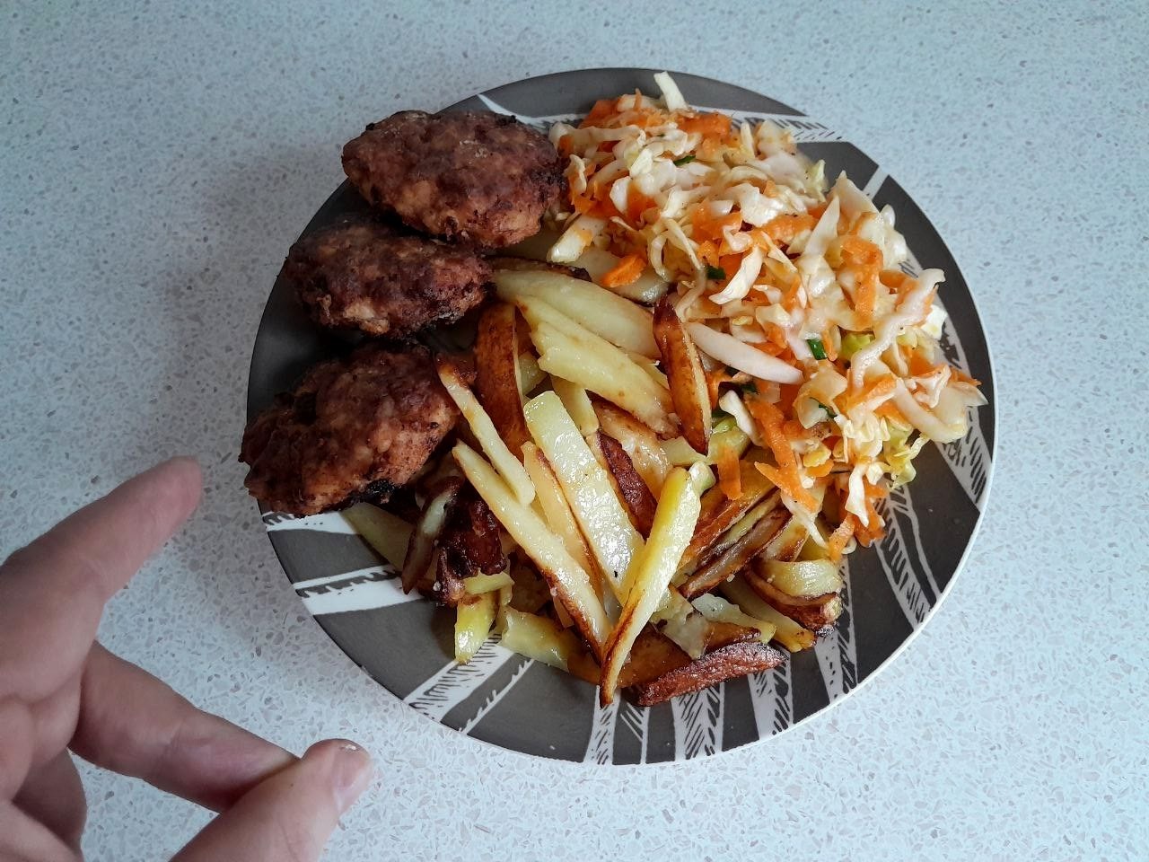 Здравствуйте товарищи! Вот мой Русский Корм на сегодня. Котлеты по-москальски, картофель жареный, салат из капусты. Слава России!
