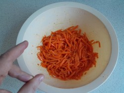 Вообще по-хорошему надо надавить чеснока. Но вместо чеснока у меня чесночный порошок. Добавляем чеснок. Разогреваем масло в сковороде, и вводим в нашу морковку. Перемешиваем. Запираем в kunteynir и прячем в холодильник на 8 часов.
