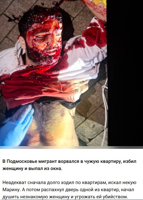 В Подмосковье мигрант-вахабит ворвался в чужую квартиру, избил женщину и мощно выпал из окна.