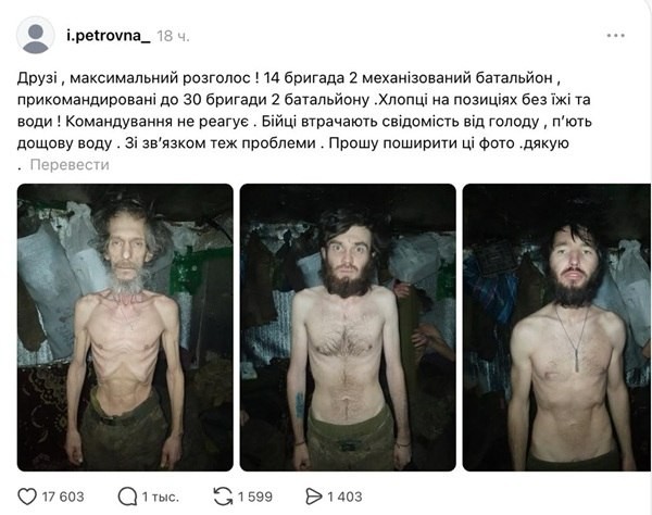Это не узники концлагеря. Это швайнехунде из 14-й бригады 2-го батальона ВСУ. Еды нет, воды нет, связи нет. Сидят по норам, пьют из луж. Мозгов сдаться не хватает (хотя скорее расчеты fpv-дронов ВСУ просто не дадут добежать).