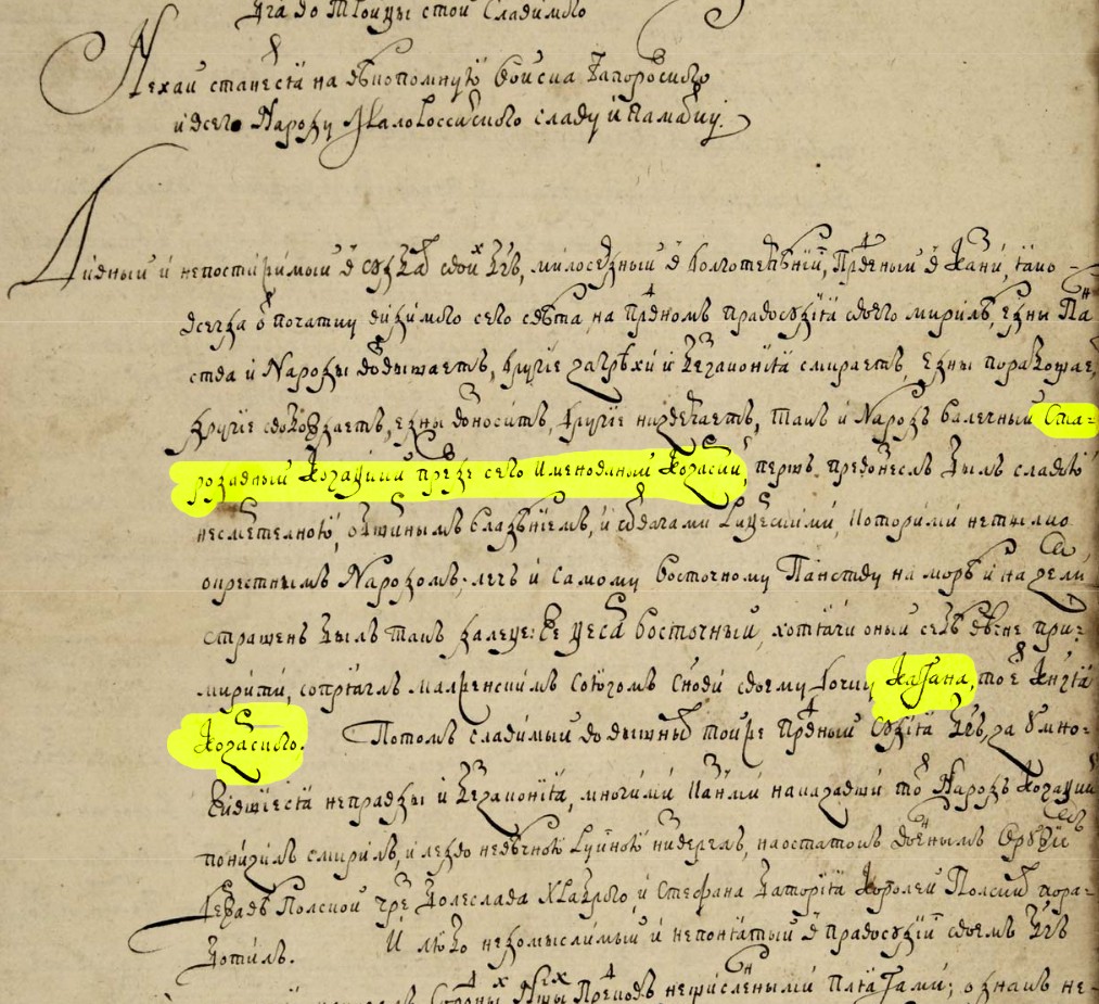 Дивный и непостижимый в судьбах своих Бог, милосердный в долготерпении, праведный в казни, како всегда от початку видимого сего света, на праведном правосудия своего мирил едны паства и народы возвышает, другие – за грехи и беззакония смиряет, едны порабощает, другие – свобождает, едны возносит, другие – низвергает, так и народ валечный стародавный КОЗАЦКИЙ, прежде сего именованый КОЗАРСКИЙ, перш превознесл был славою несмертелно… Далее…