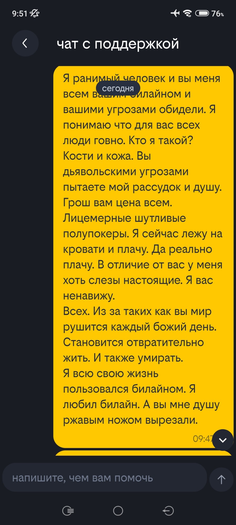 Я всю свою жизнь пользовался билайном. Я любил билайн. А вы мне душу ржавым ножом вырезали.